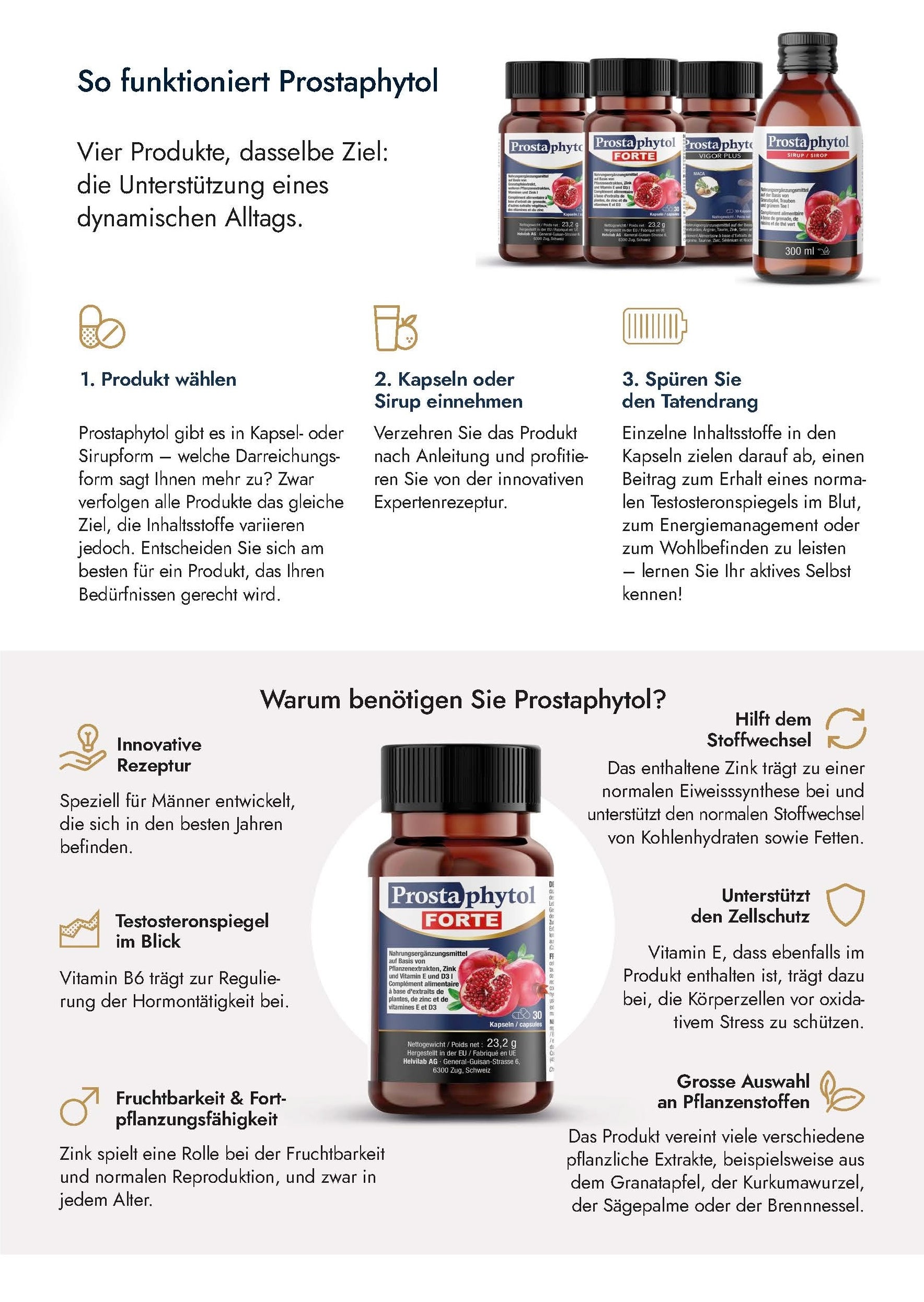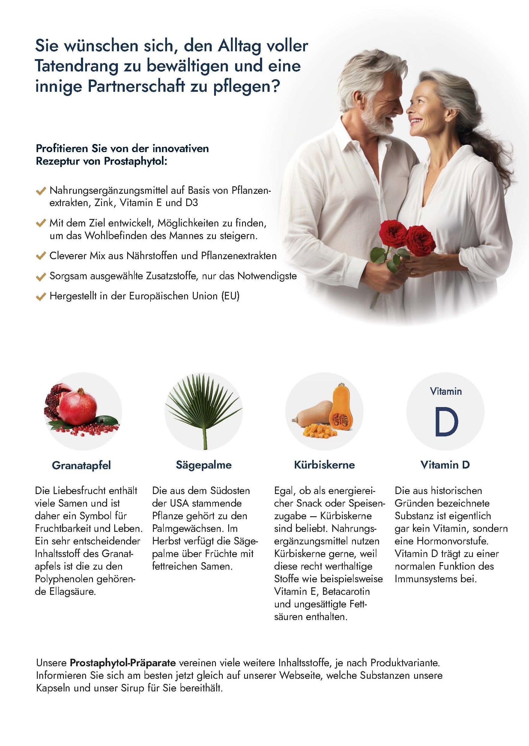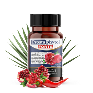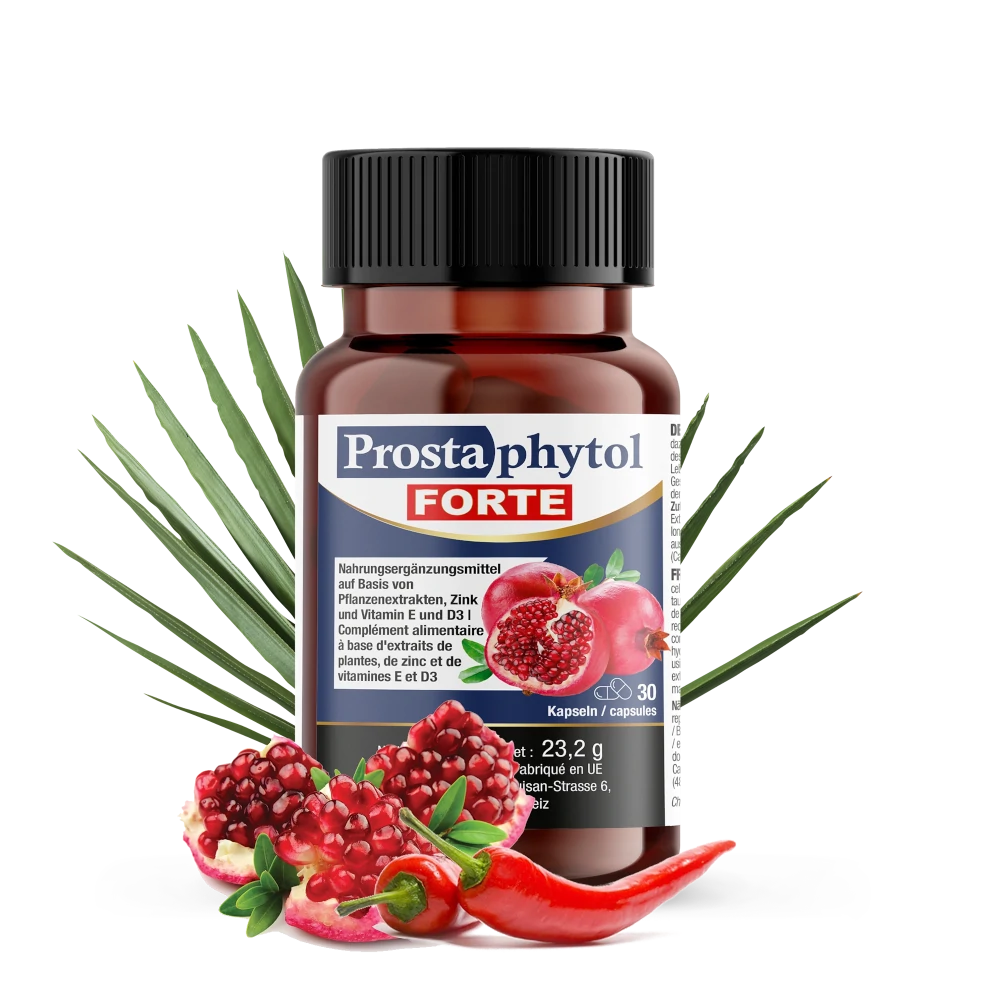 Extrakt von Sägepalmenfrucht (Serenoa repens (Bartram), Füllstoff: mikrokristalline Cellulose, Hydroxypropylmethylcellulose (Kapsel pflanzlichen Ursprungs), Extrakt aus Brennnesselwurzel (Urtica dioica), Lycopin, Extrakt aus Kurkumawurzel (Curcuma longa L.), Trennmittel: Magnesiumsalze der Speisefettsäuren und Calciumsilicat, Extrakt aus Granatapfelfrucht (Punica granatum L.), Extrakt aus Kürbiskernen (Cucurbita pepo), Extrakt aus oberirdischen Teilen von Epilobium (Epilobium angustifolium L.), DL-alpha-Tocopherylacetat, Extrakt aus der Frucht von Cayenne (Capsicum annuum L.), Zinkoxid, Cholecalciferol.