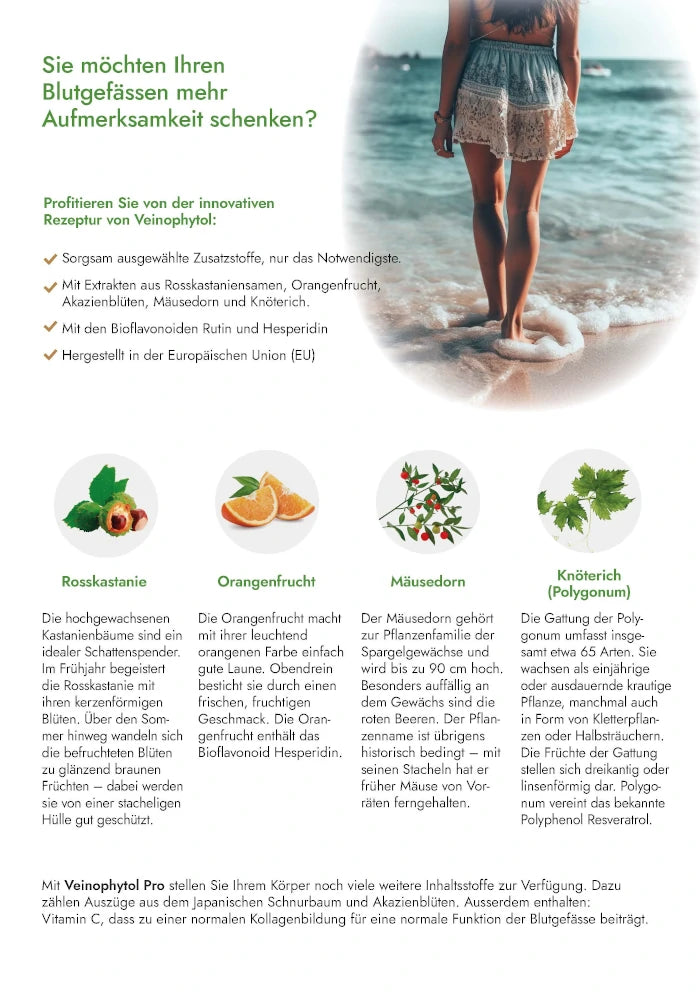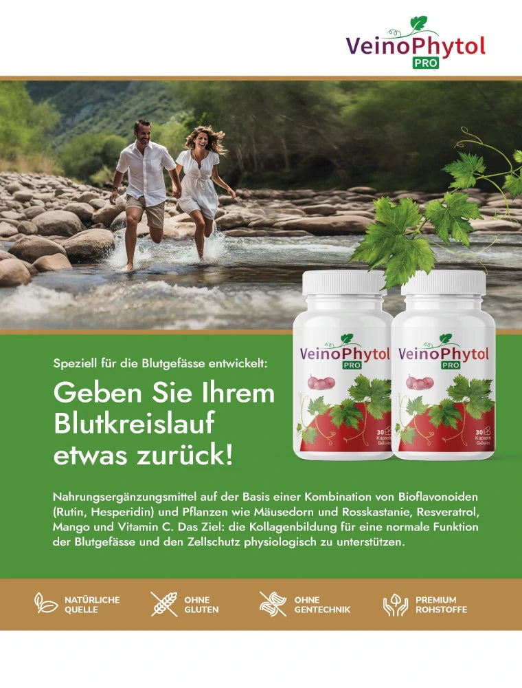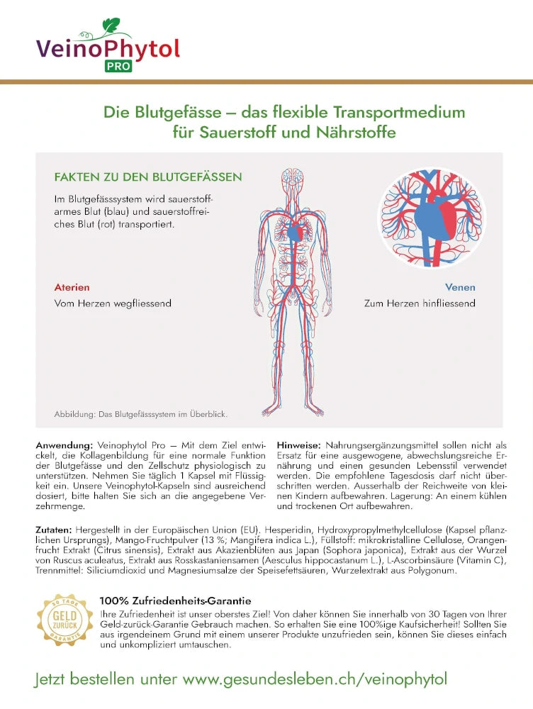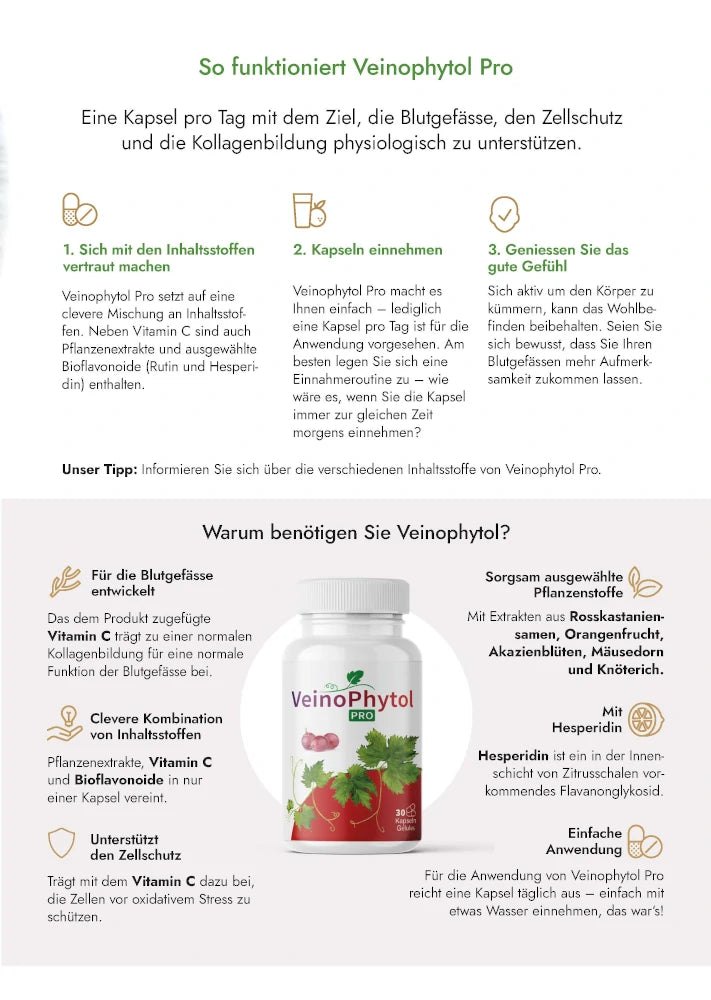 Veinophytol Pro – Developed with the aim of physiologically supporting collagen formation for normal blood vessel function and cell protection. Take 1 capsule daily with liquid. Our Veinophytol capsules are adequately dosed, please stick to the indicated consumption amount.